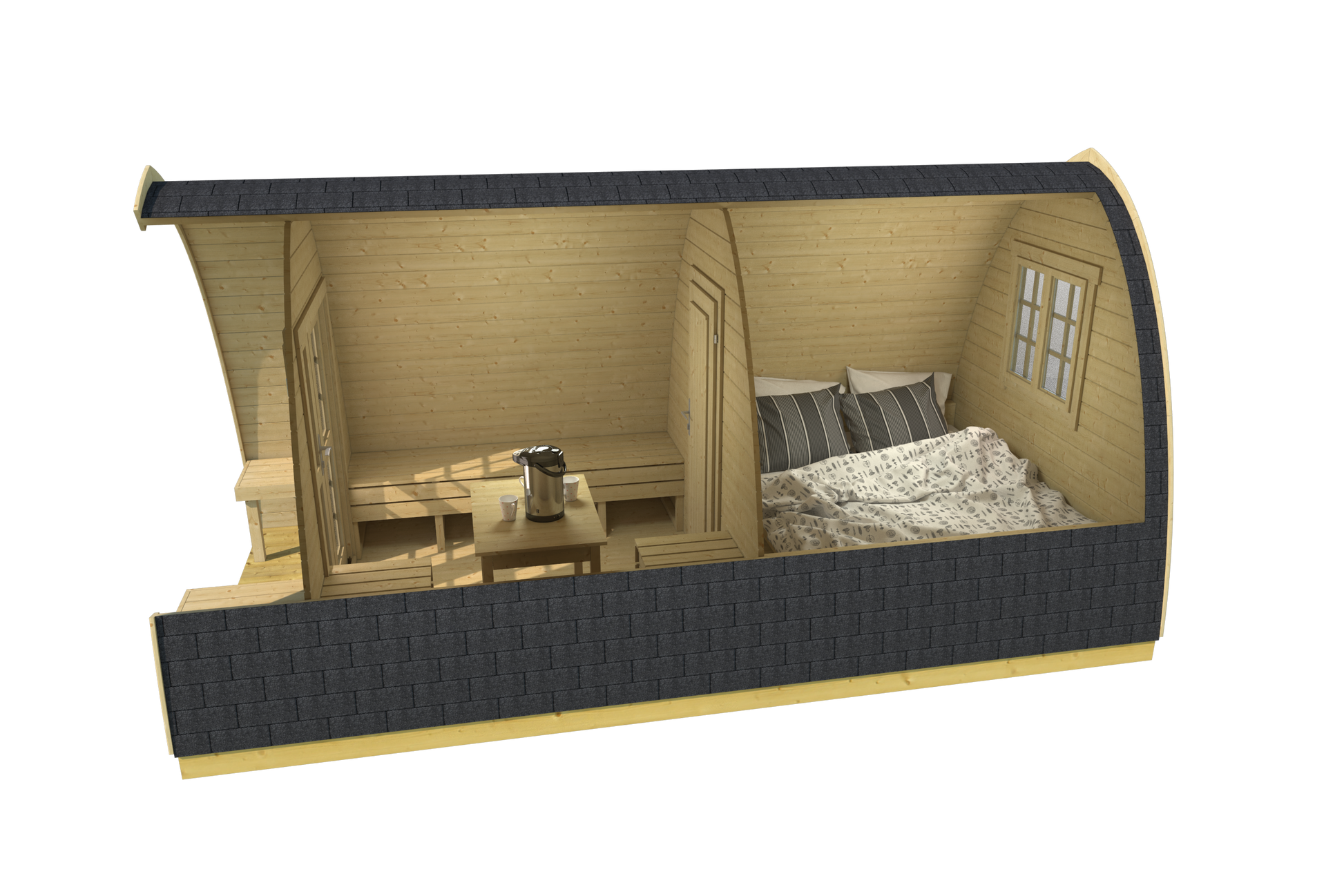 A Glamping Pod 480 é uma cabana de madeira ideal para projetos de turismo de natureza e glamping de luxo. Com 4,8 metros de comprimento, esta estrutura oferece um espaço acolhedor e funcional, perfeito para casais ou pequenas famílias que procuram conforto em plena natureza. Com portas de vidro duplo e janelas panorâmicas, a cabana recebe muita luz natural e proporciona vistas deslumbrantes do exterior. O telhado em arco com acabamento em telhas garante proteção durante todo o ano, em qualquer condição climática.